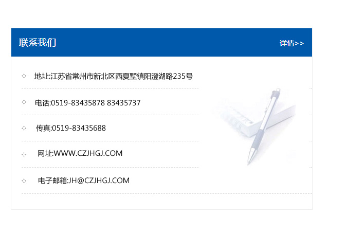 傳真:0519-83435688    郵編:213135    網址:WWW.czjhgj_com.kmsener.com    電子郵箱:JH@czjhgj_com.kmsener.com